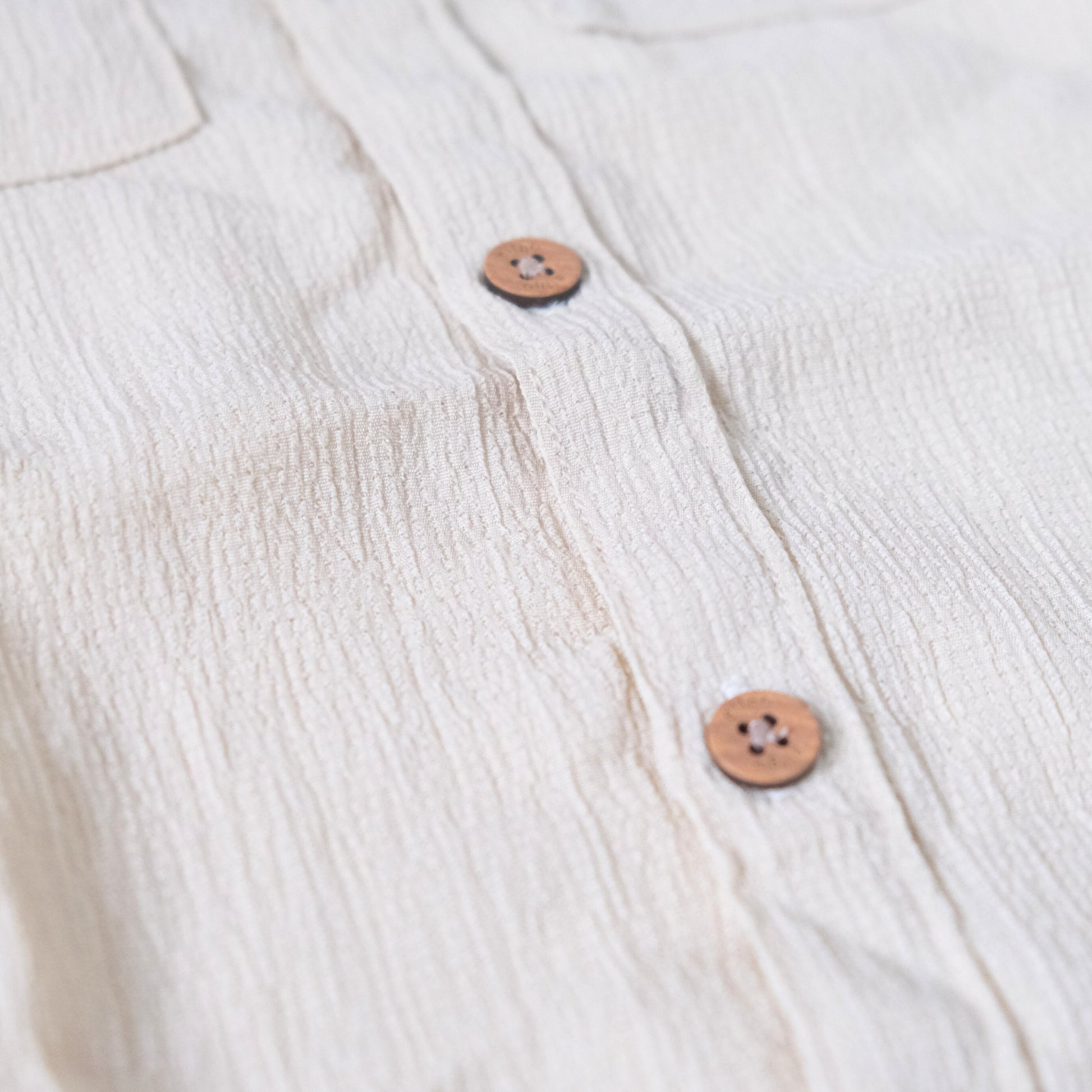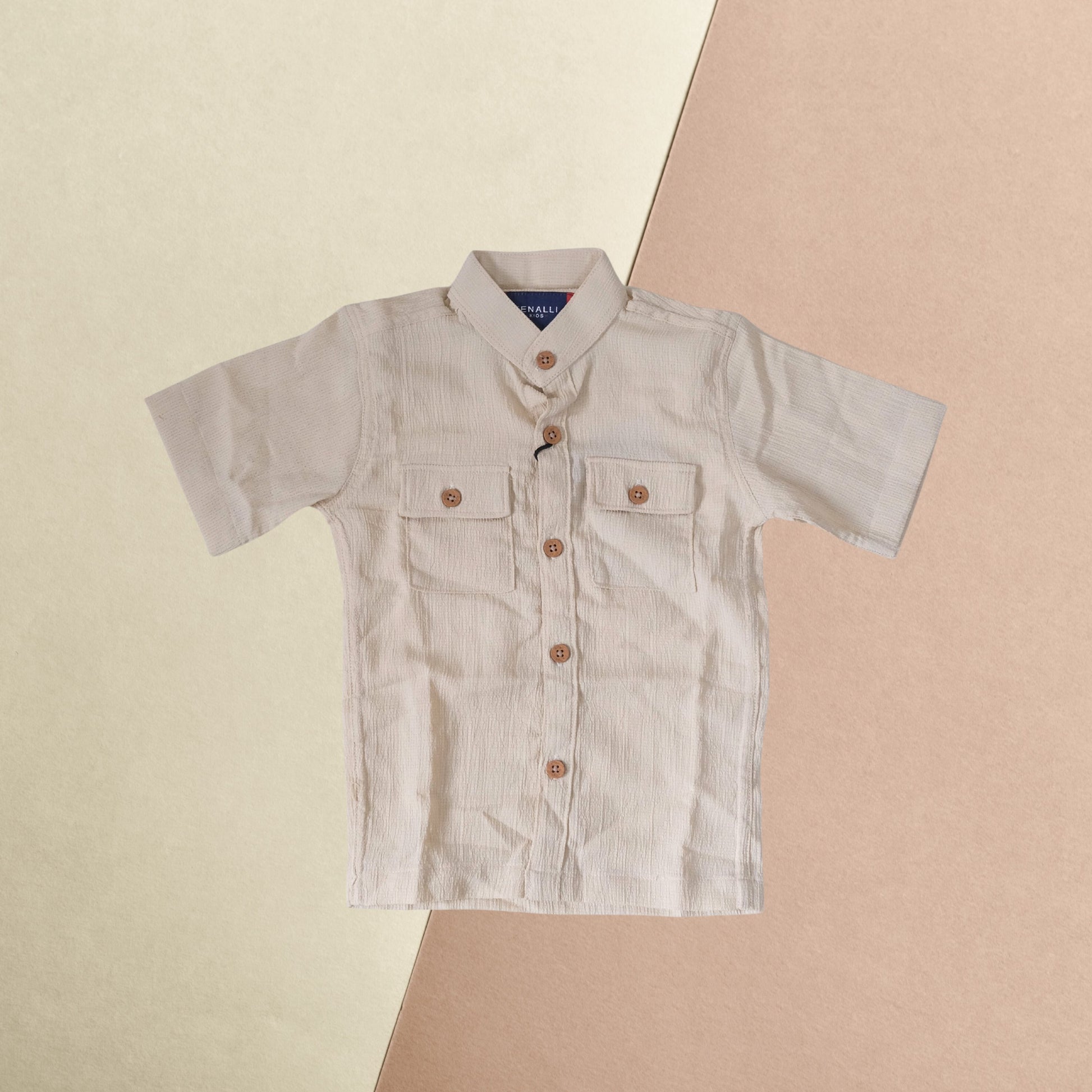 Elevate your child’s wardrobe with this sophisticated beige shirt featuring a stylish mandarin collar and double front pockets. Crafted from a textured, breathable fabric, this shirt blends traditional charm with modern design. The short sleeves and wooden-style buttons add a refined touch, perfect for festive occasions, family functions, or smart casual wear.
