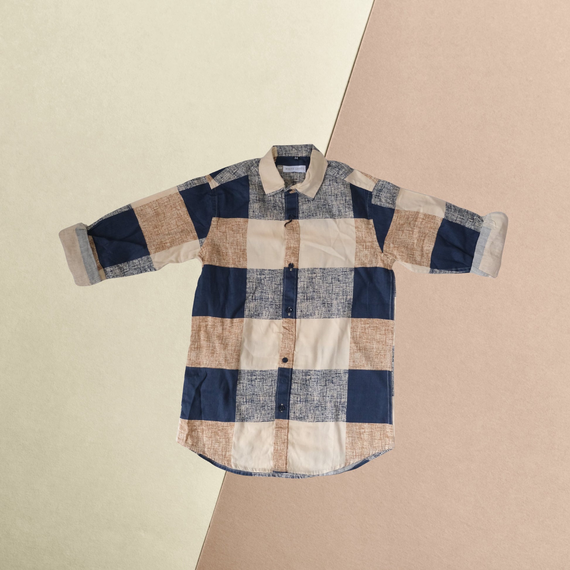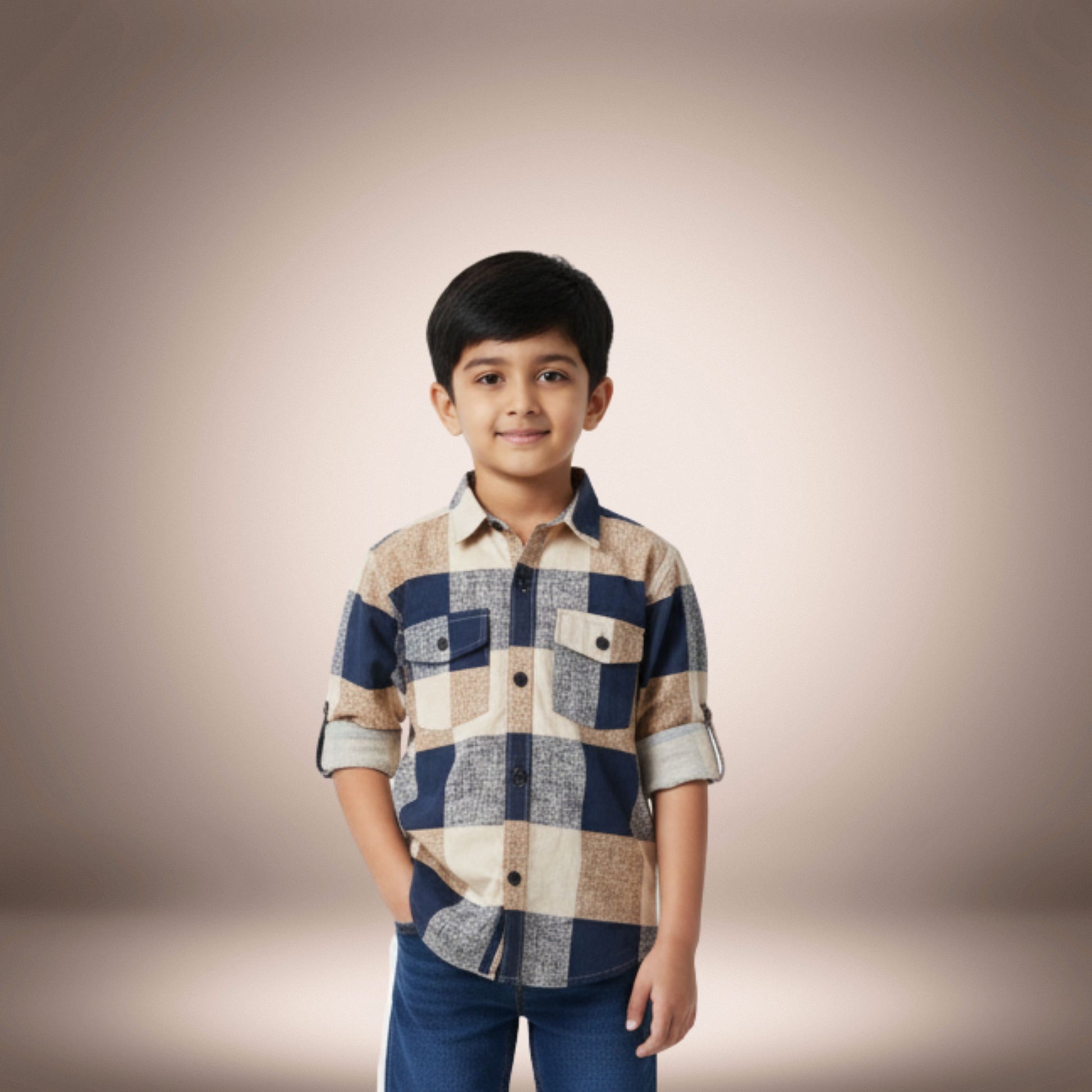 Upgrade your little one’s wardrobe with this stylish and comfortable checkered shirt. Featuring a bold, multi-tone check pattern in shades of navy blue, beige, and tan, this shirt adds a timeless touch to any casual outfit. Made from soft, breathable fabric, it ensures all-day comfort for active kids.