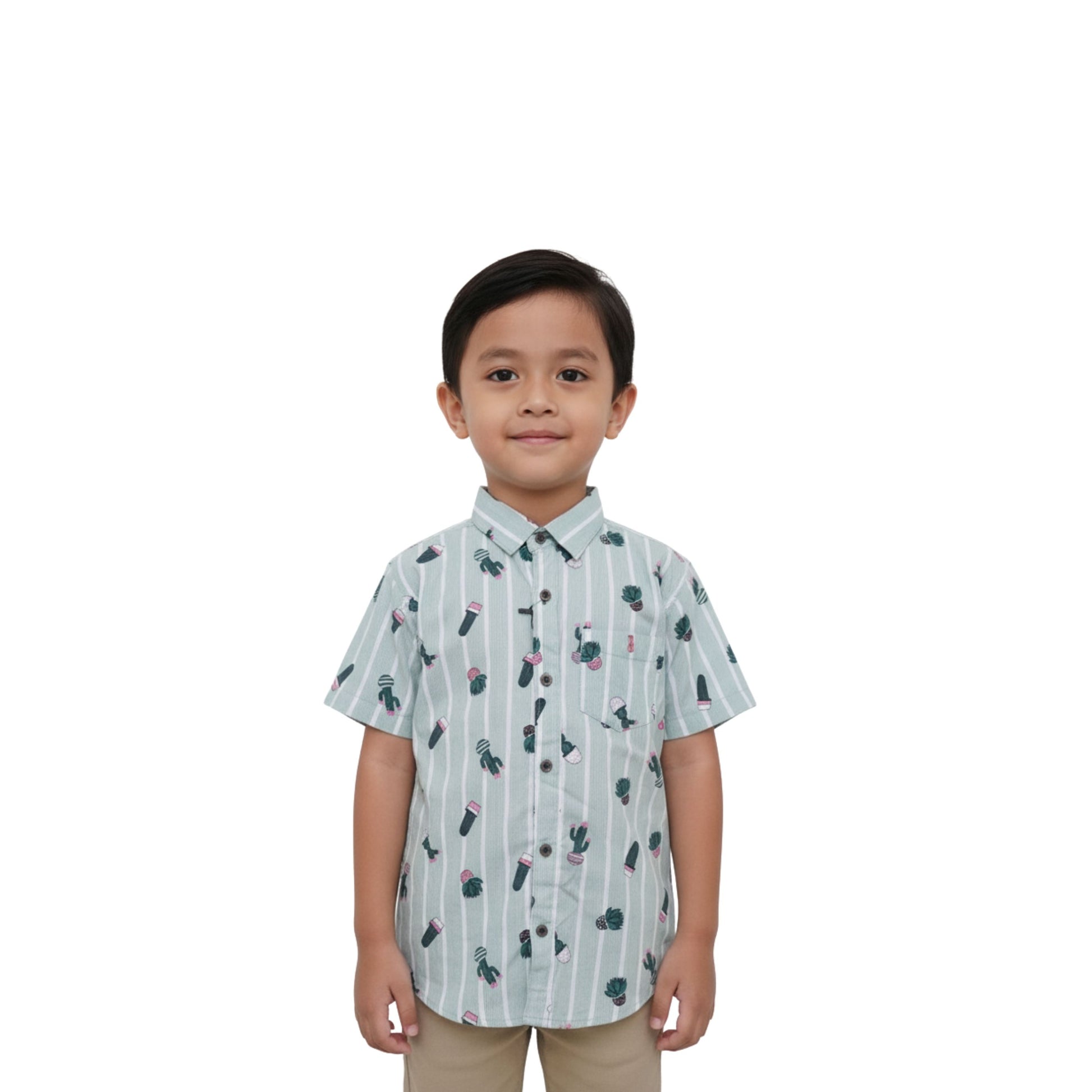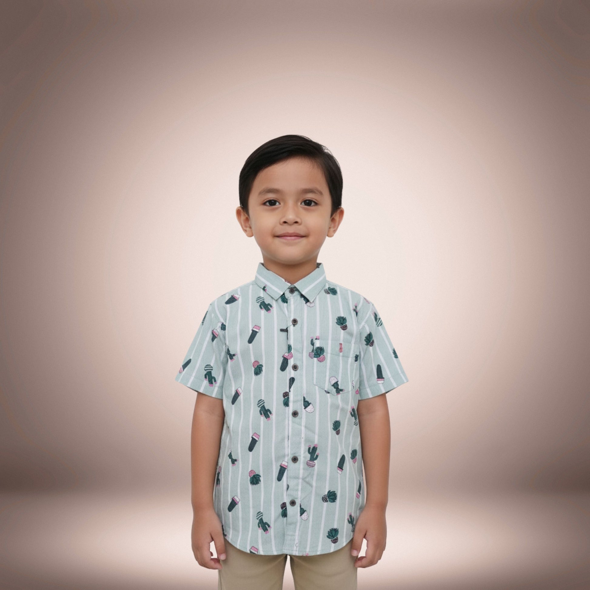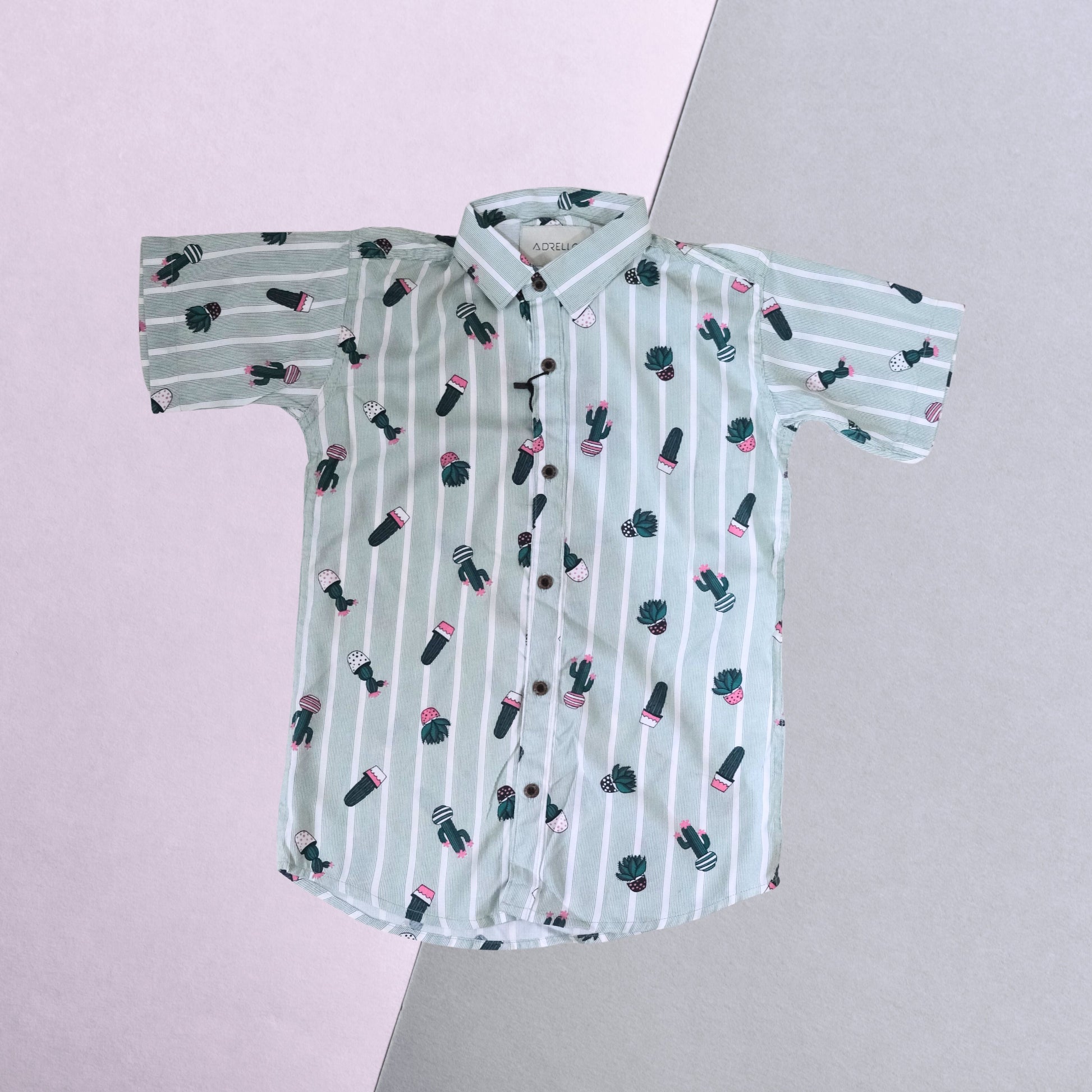 Brighten up your child’s wardrobe with this playful green striped shirt featuring quirky plant pot and leaf prints. Designed with a smart collar and short sleeves, this shirt blends fun with function, making it perfect for casual outings, playdates, or weekend wear. The breathable cotton blend ensures all-day comfort, while the button-down front and chest pocket add a classic touch.